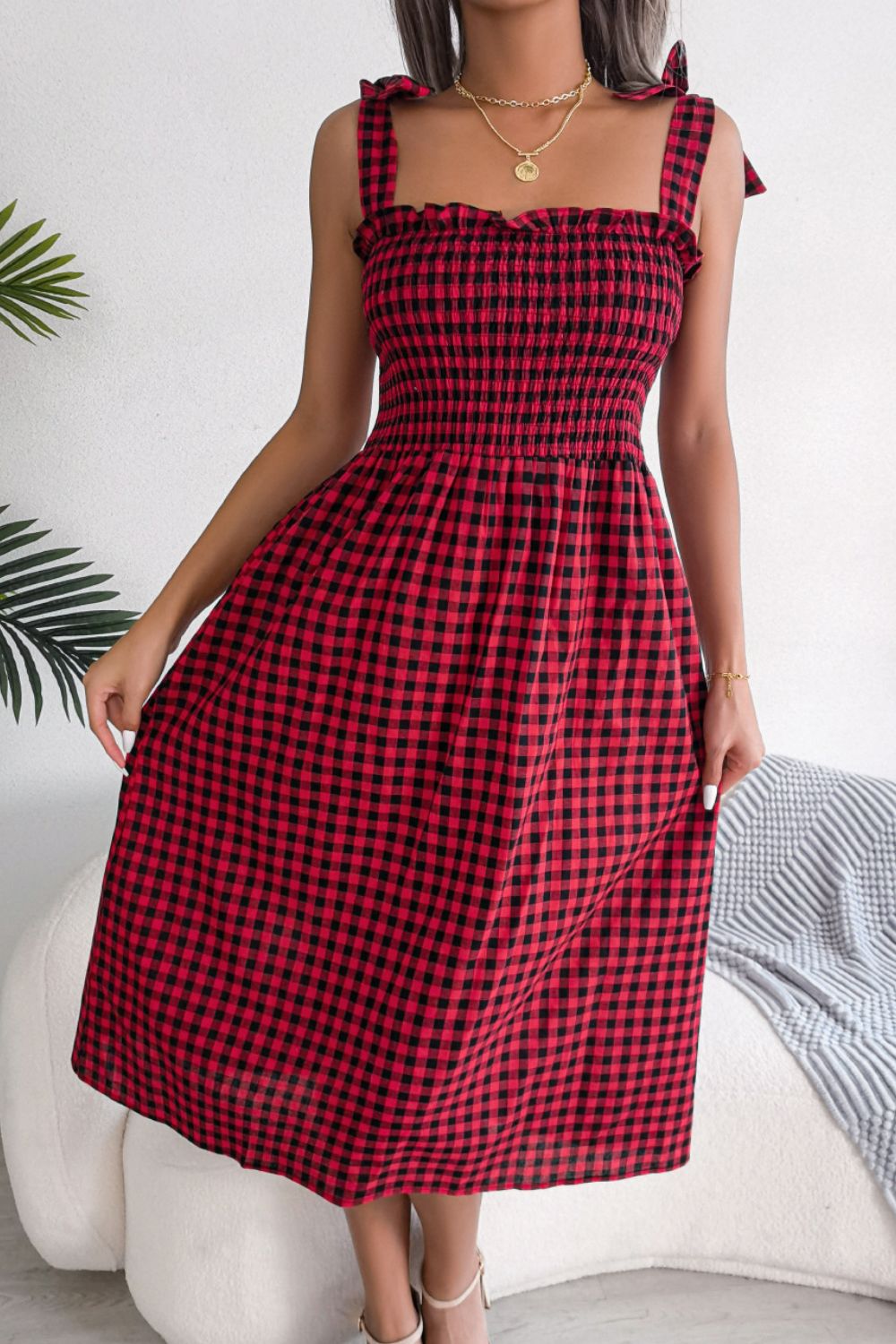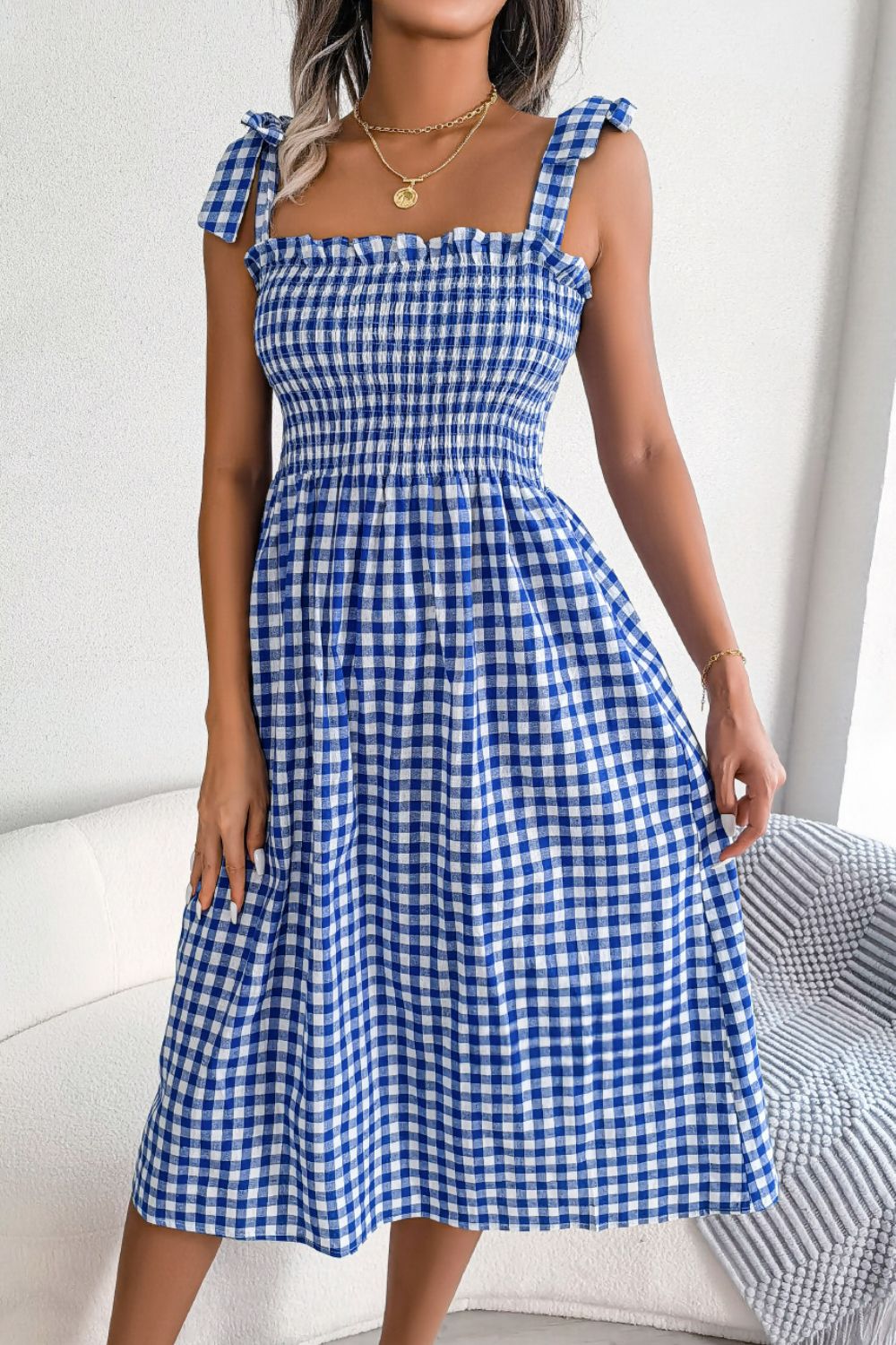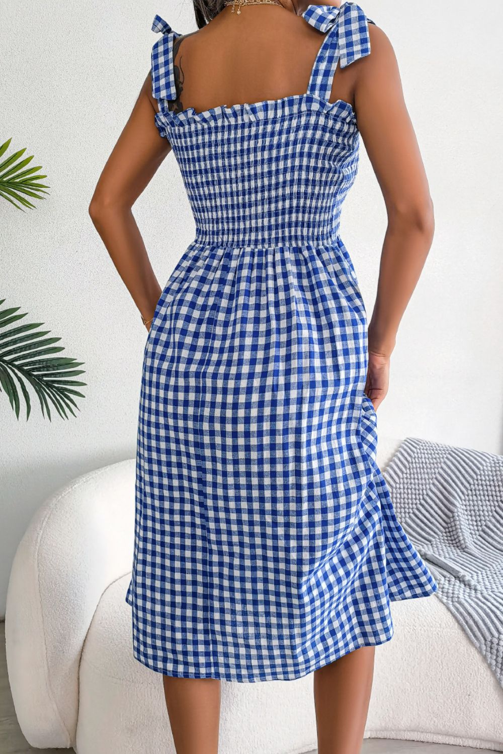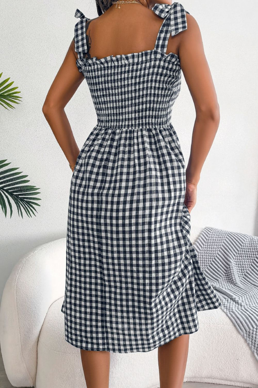 - Features: Smocked, tie