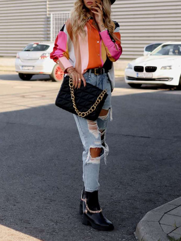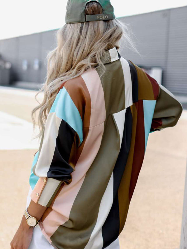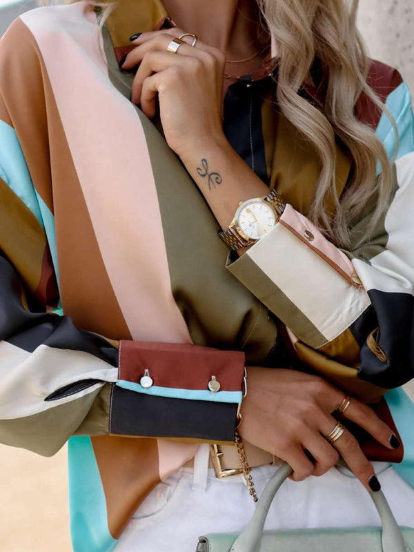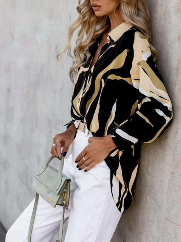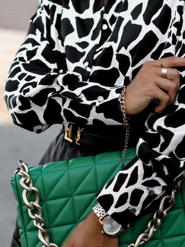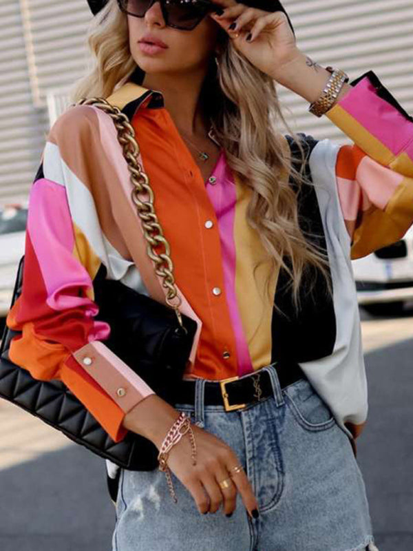Women’s Abstract Bright Print Off Shoulder Puff Sleeve Button Cuffs Shirt